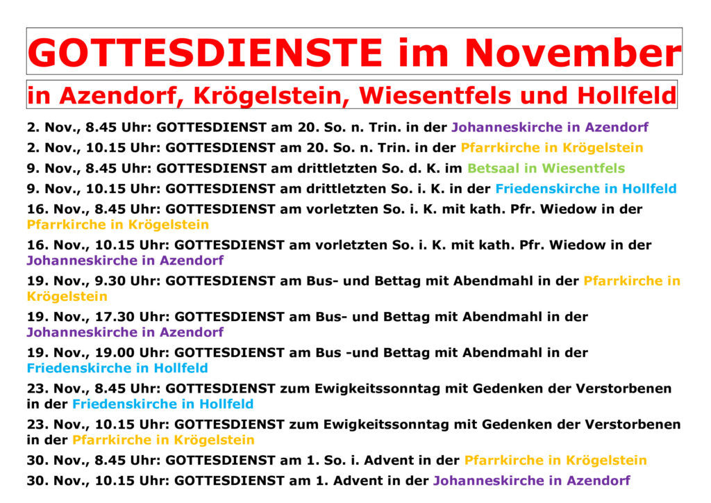 Die Gemeinden Azendorf, Hollfeld und Krögelstein haben einen gemeinsamen Gottesdienstplan. Es gibt vier Gotteshäuser: die Johanniskirche in Azendorf, die Friedenskirche in Hollfeld, die Pfarrkirche in Krögelstein, und der Betsaal in Wiesentfels. Im Sommer werden die Gottesdienste immer wieder mal im Freien gefeiert: in Krögelstein auf der Pfarrwiese über dem Pfarrhaus, in Hollfeld im Kirchhof der Friedenskirche und manchmal auch im Schlosshof in Wiesentfels. Wie Sie dort hinfinden, lesen Sie bitte unter „Kontakt“.
