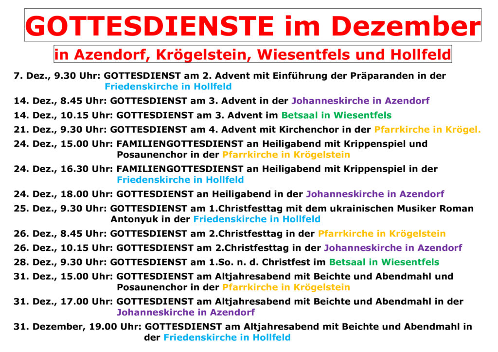 Die Gemeinden Azendorf, Hollfeld und Krögelstein haben einen gemeinsamen Gottesdienstplan. Es gibt vier Gotteshäuser: die Johanniskirche in Azendorf, die Friedenskirche in Hollfeld, die Pfarrkirche in Krögelstein, und der Betsaal in Wiesentfels. Im Sommer werden die Gottesdienste immer wieder mal im Freien gefeiert: in Krögelstein auf der Pfarrwiese über dem Pfarrhaus, in Hollfeld im Kirchhof der Friedenskirche und manchmal auch im Schlosshof in Wiesentfels. Wie Sie dort hinfinden, lesen Sie bitte unter „Kontakt“.