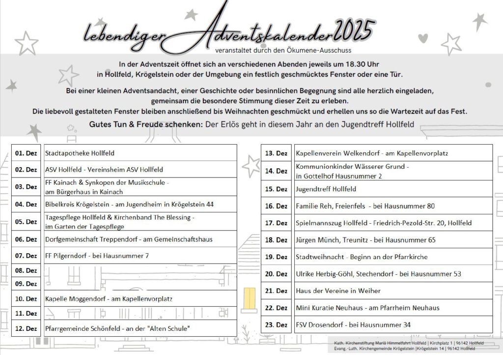 Auch dieses Jahr richten wir wieder unsere traditionell ökumenische Aktion „Lebendiger Adventskalender“ aus. An Abenden im Dezember treffen sich regelmäßig um 18.30 Uhr in den Straßen unserer Gemeinden Nachbarn, Freunde und Fremde jeweils vor einem Haus oder einer Einrichtung zu einer kleinen Adventsfeier.